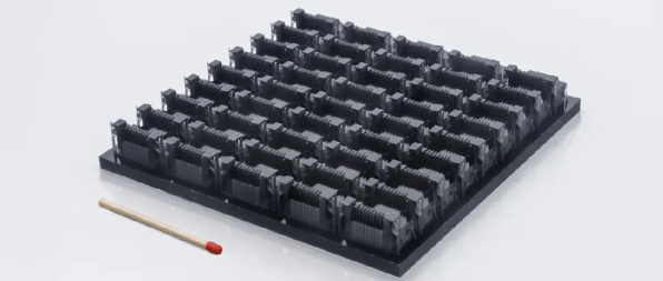 那么比如在精密電子領域,這款設備能打印芯片接插件、連接器、傳感器等復雜精密結構件,用于小批量、規(guī)模化精密儀器的生產制造,充分滿足生產商對精密復雜連接器等零部件的批量生產需求,能極大提升生產效率。比如說AI芯片,它上面用的一些封裝的背板或連接器。一塊AI的CPU上要打很多芯片,背板的面積是固定的,但其表面布滿了上千個小孔,所需精度要求很高,那么就需要2μm精度去做,但是其他部分的精度要求相對沒那么高,可能10微米或者25微米就能滿足了。